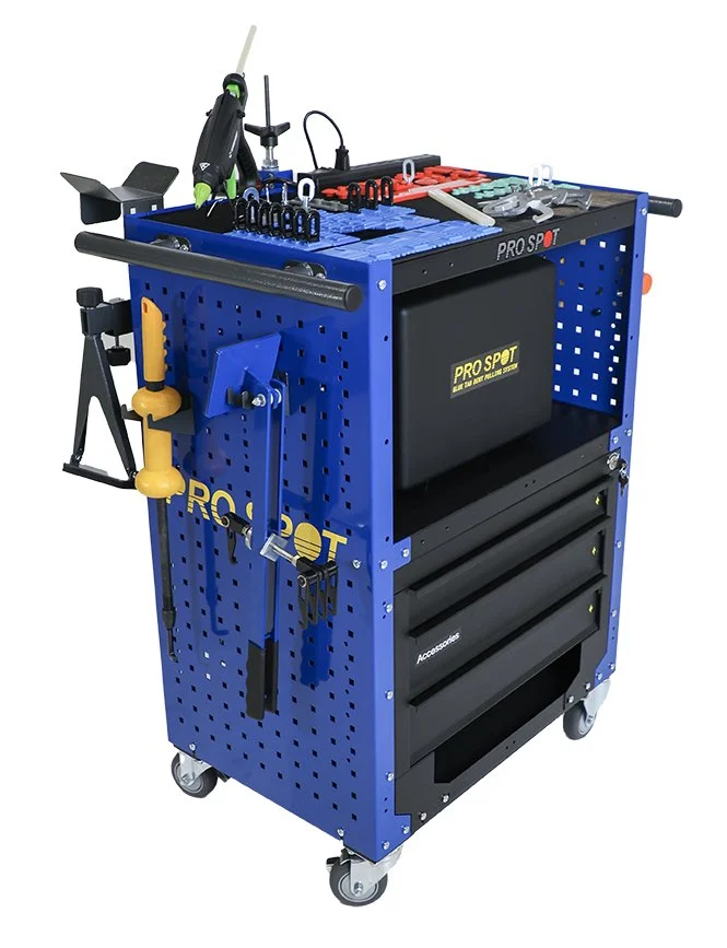 The Glue Tab Dent Repair Station includes our complete kit, as well as a mobile cart, storage and the pulling tools and accessories to pull any dent.