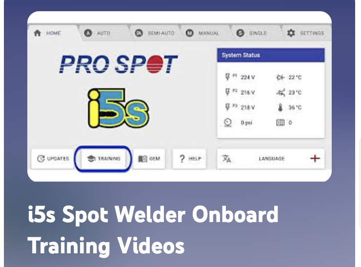 The new Pro Spot i5s Smart Spot Welding System comes equipped with the industry’s most advanced adaptive auto welding technology and robust on-board training resources. The i5s advanced welding control system senses, reacts and adjusts welding energy based on material composition, thickness and resistance properties in real-time.