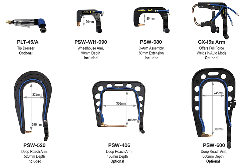 i5s Spot Welder comes with variety of accessories. Additionally, Pro Spot offers a variety of optional arms for deeper reach. The biggest advantage of the new arms is a wider distance to get around large panels in contemporary car designs. Arm design includes longer electrodes to reach those deeper pockets we see in todays vehicles. Water cooling is provided to the tip, which is a requirement with car manufacturers.