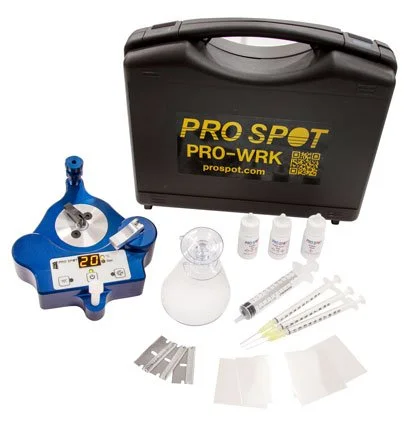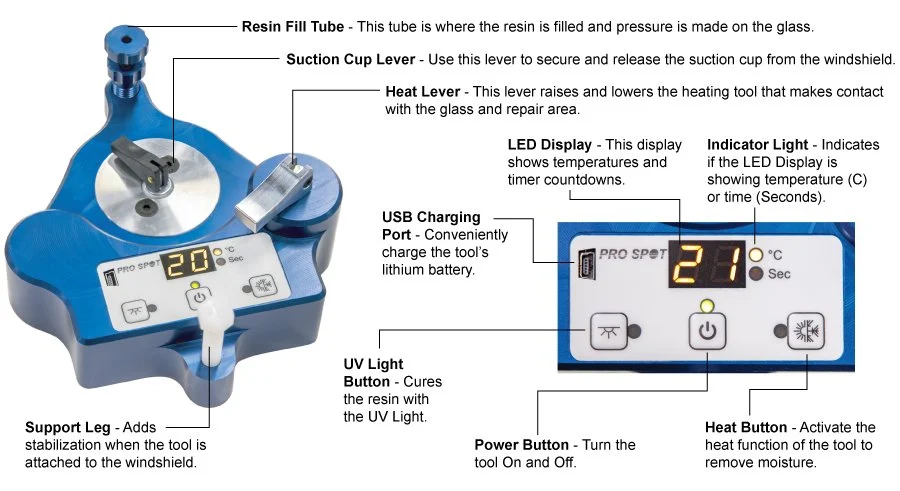 The Windshield Repair Kit (PRO-WRK) is a new, easy to use 4-in-1 automated glass chip repair system. The well designed, precision machined tool is made of aluminum alloy, making this tool lightweight but very durable. The tool sets up quickly over the chip and each repair step is just a quick turn of the tool - simple, fast and complete.